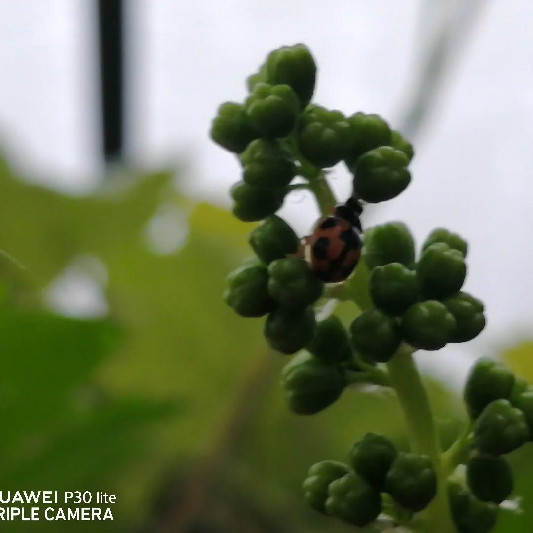 ぶどうの赤ちゃんの粒の間に てんとう虫発見