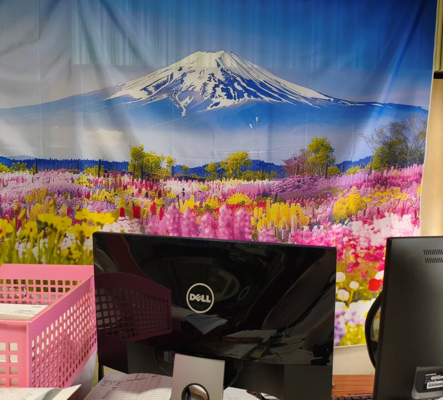 古びた襖を隠すように 大好きな富士山を目の前にして事務作業